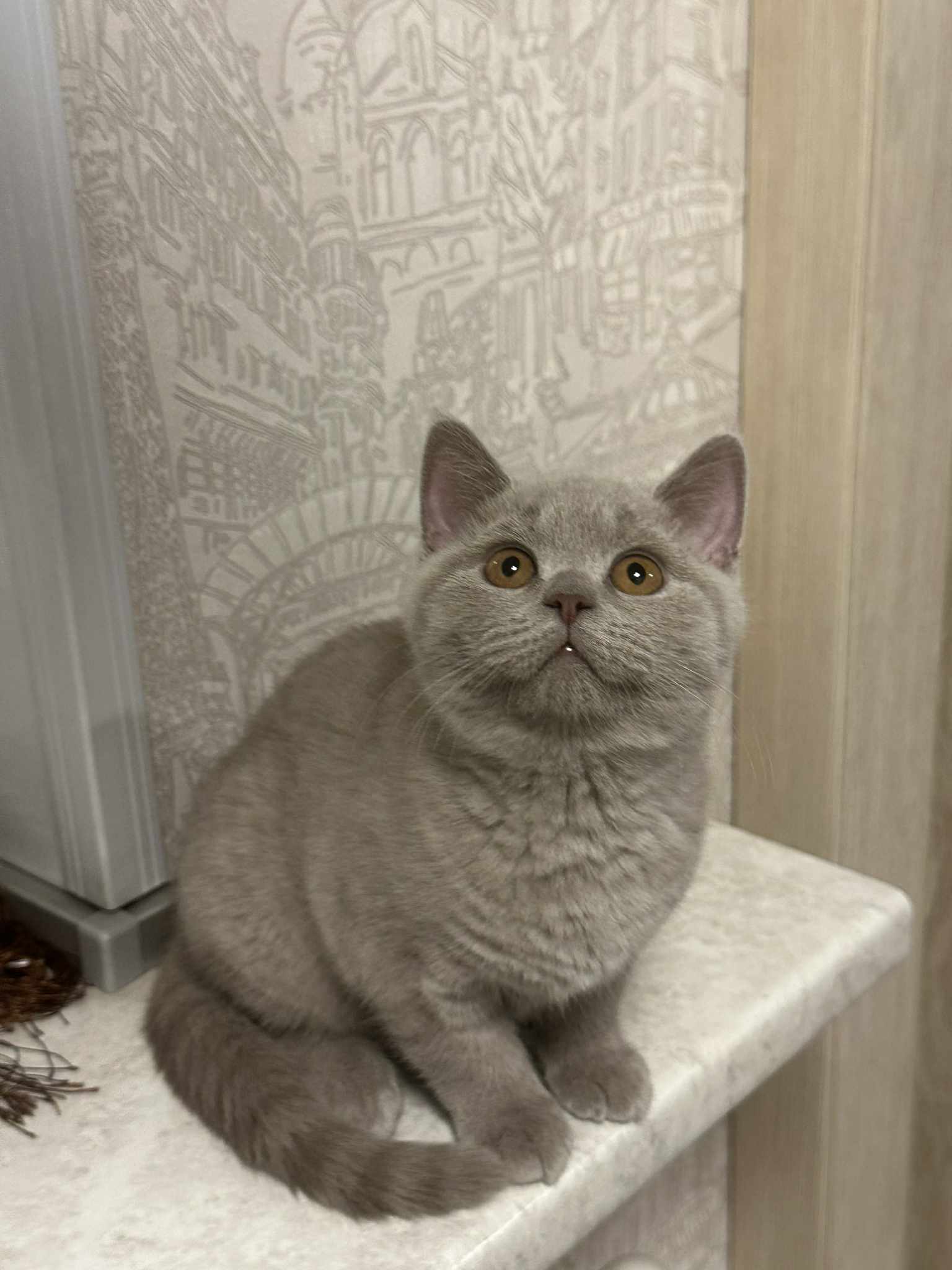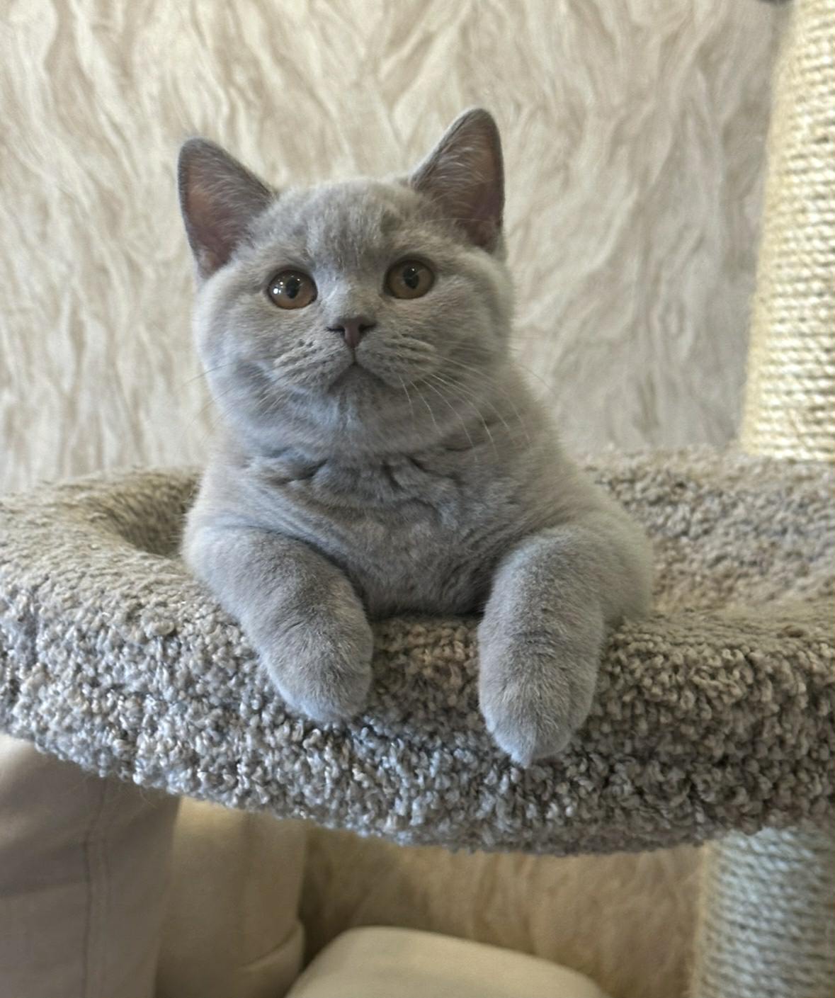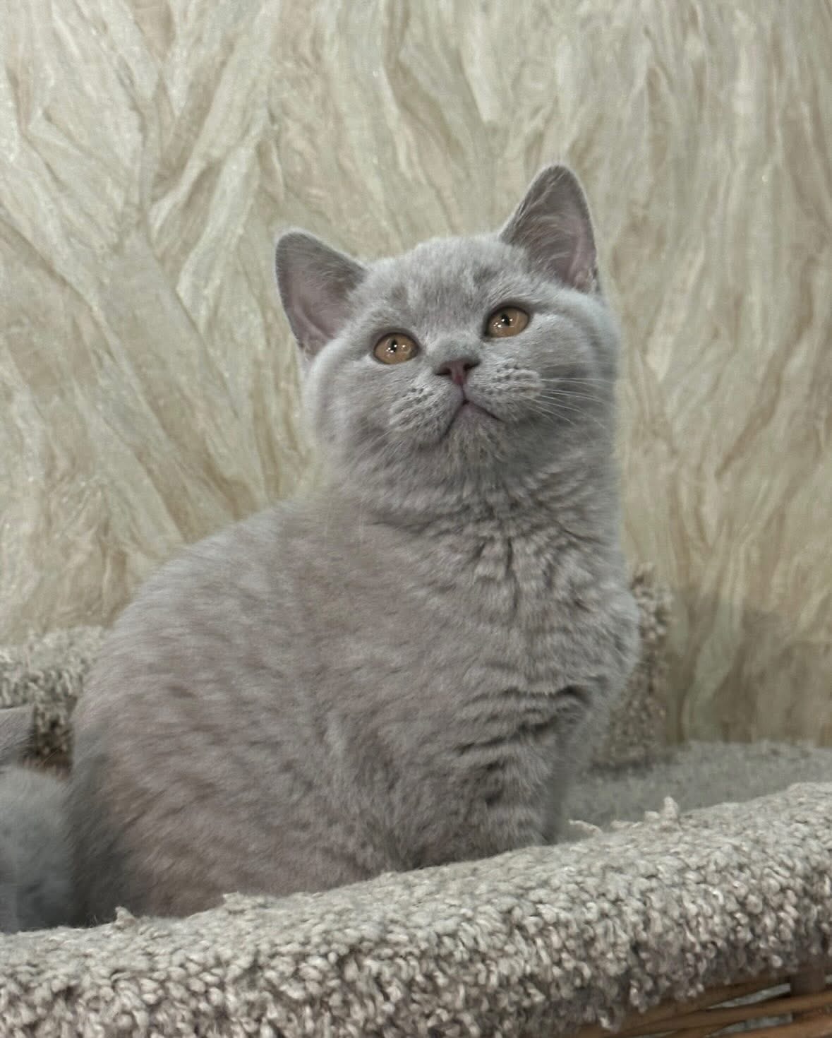 A rare lilac-colored kitten with a soft, silvery-lavender coat, warm pink undertones, and bright, gentle eyes, elegant, plush, and beautifully unique.