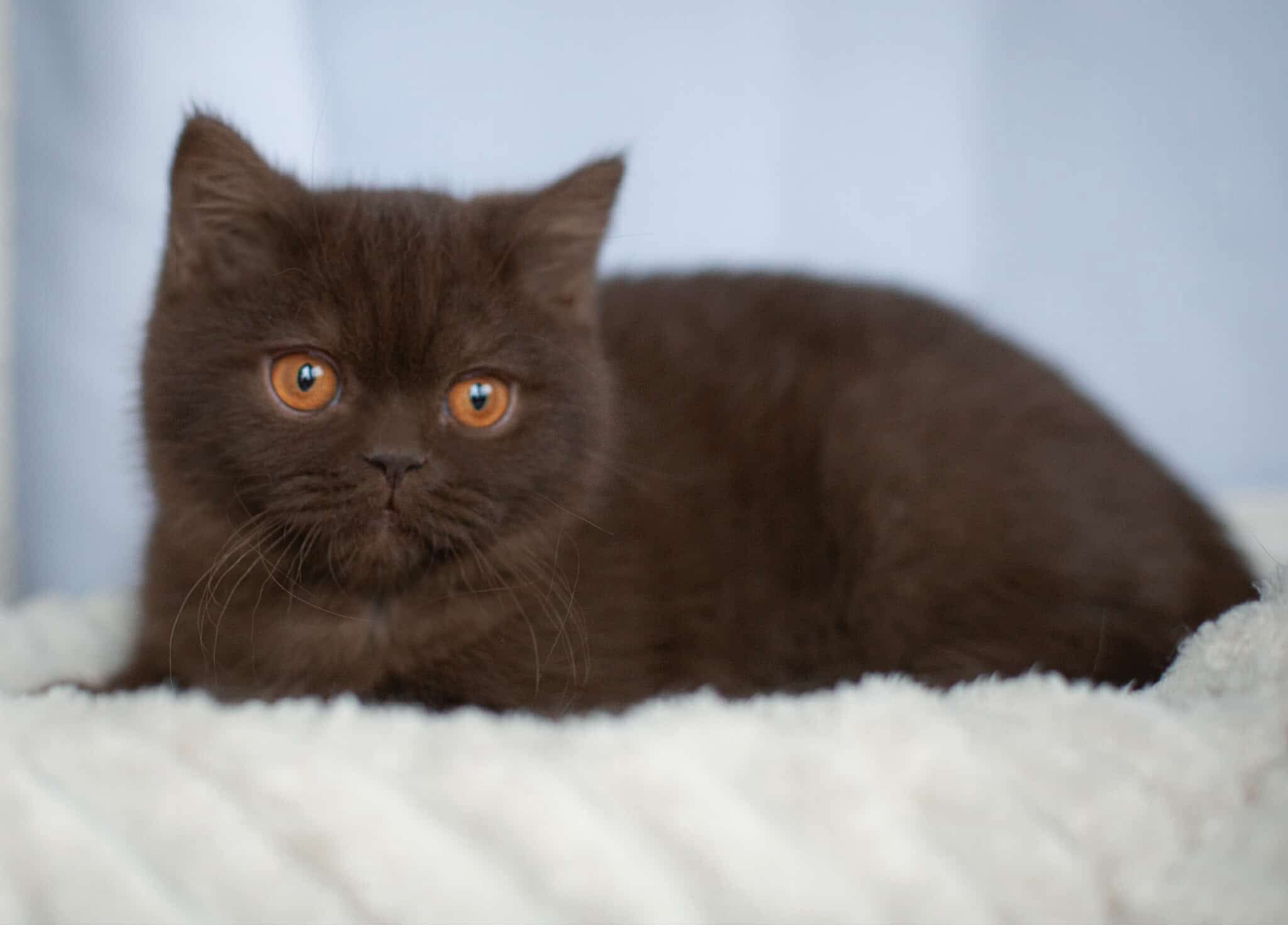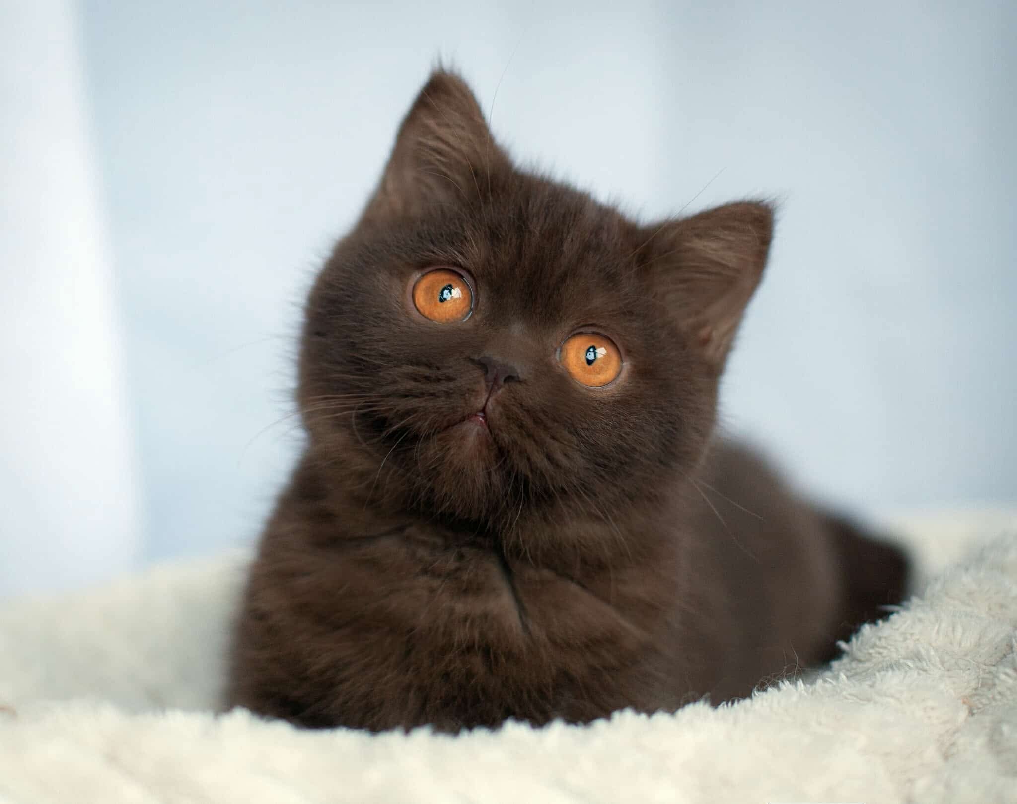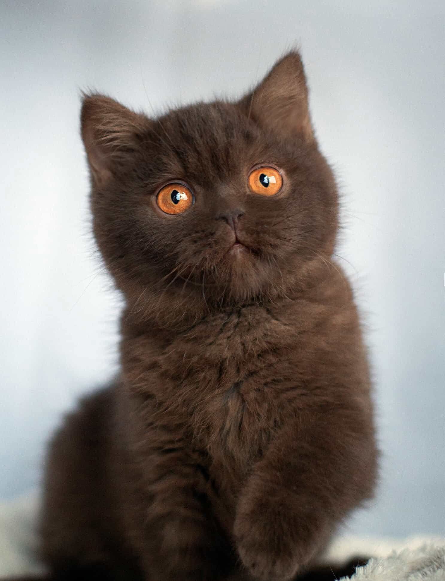 A chocolate British Shorthair kitten features a smooth, dark cocoa-colored coat, thick and plush to the touch, with a sturdy little body, round head, and soft, gentle eyes that add to its charming, cuddly look.