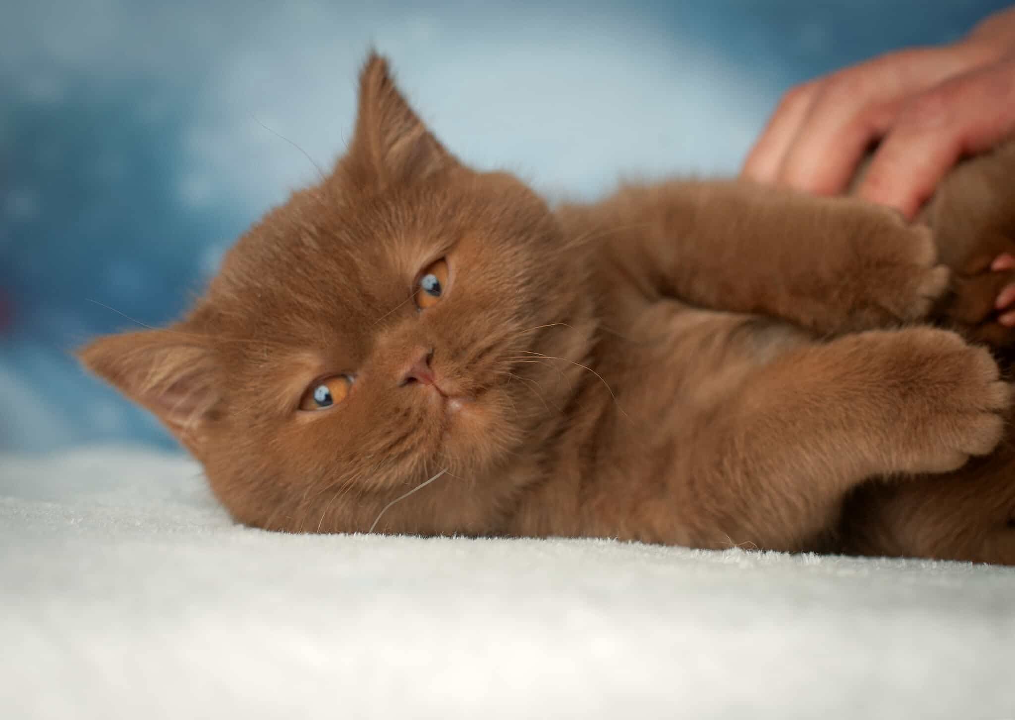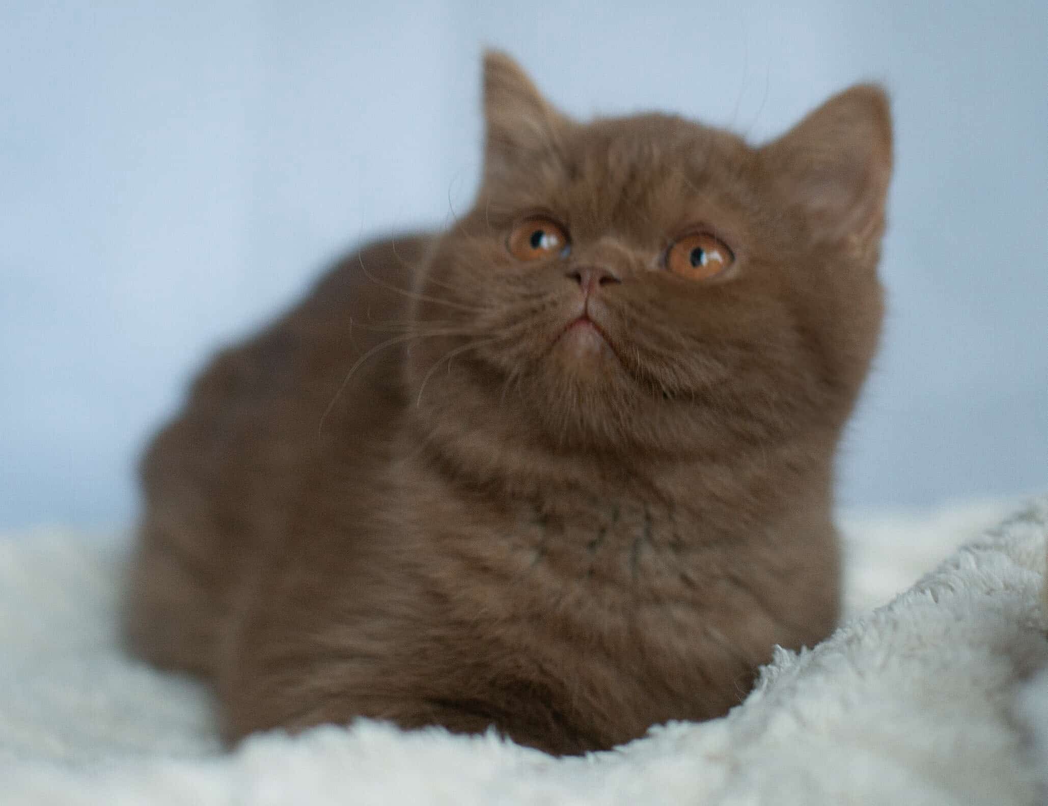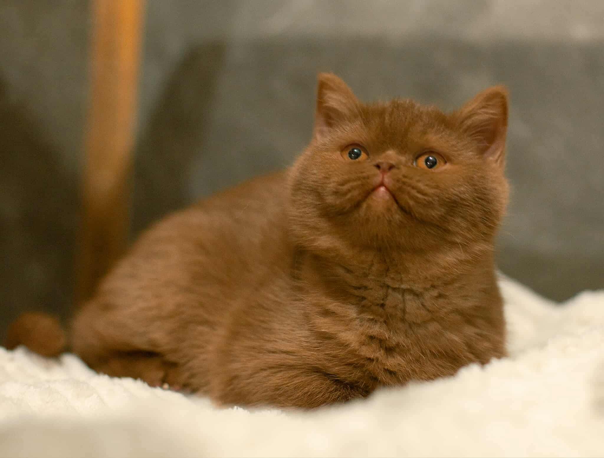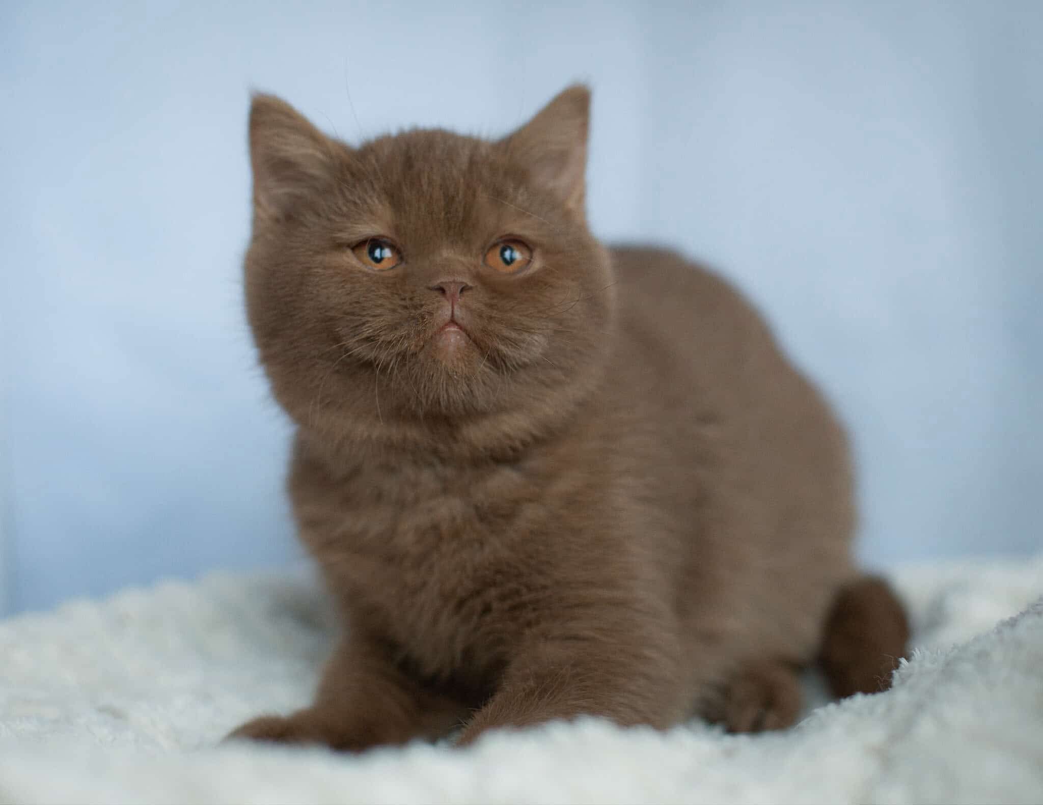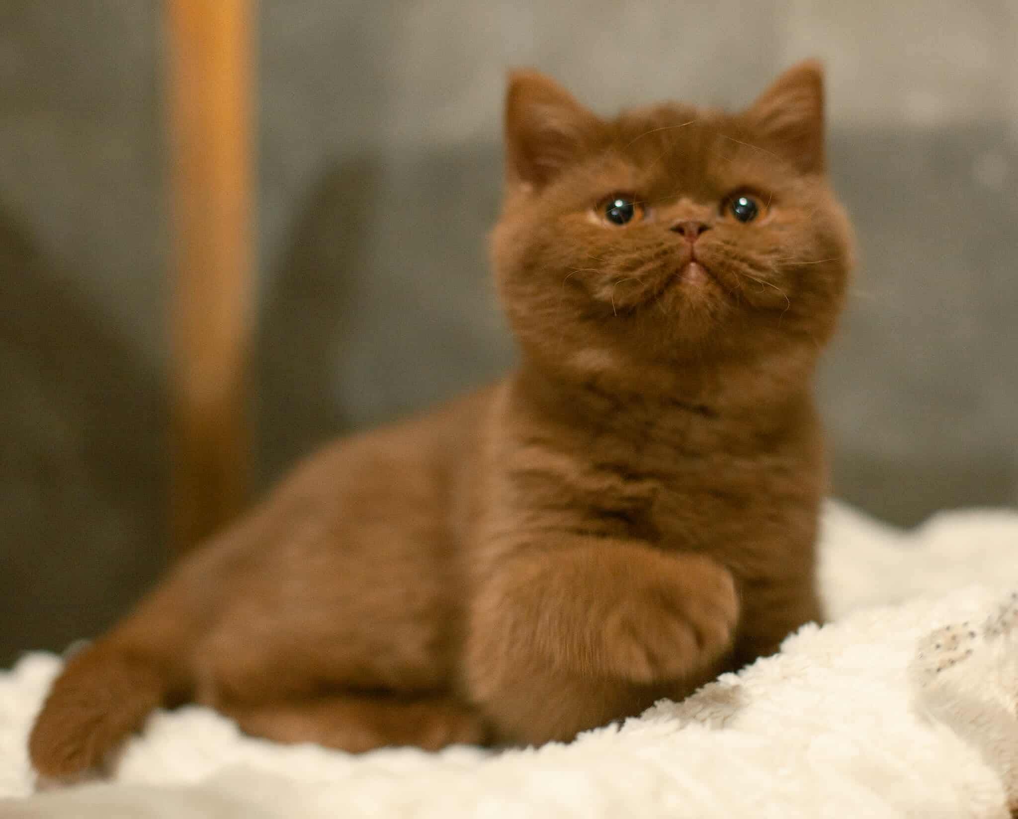 A cinnamon British Shorthair kitten has a warm, light brown coat with a soft, plush texture, round face, chubby cheeks, and big expressive eyes, giving her a sweet, teddy-bear look.
